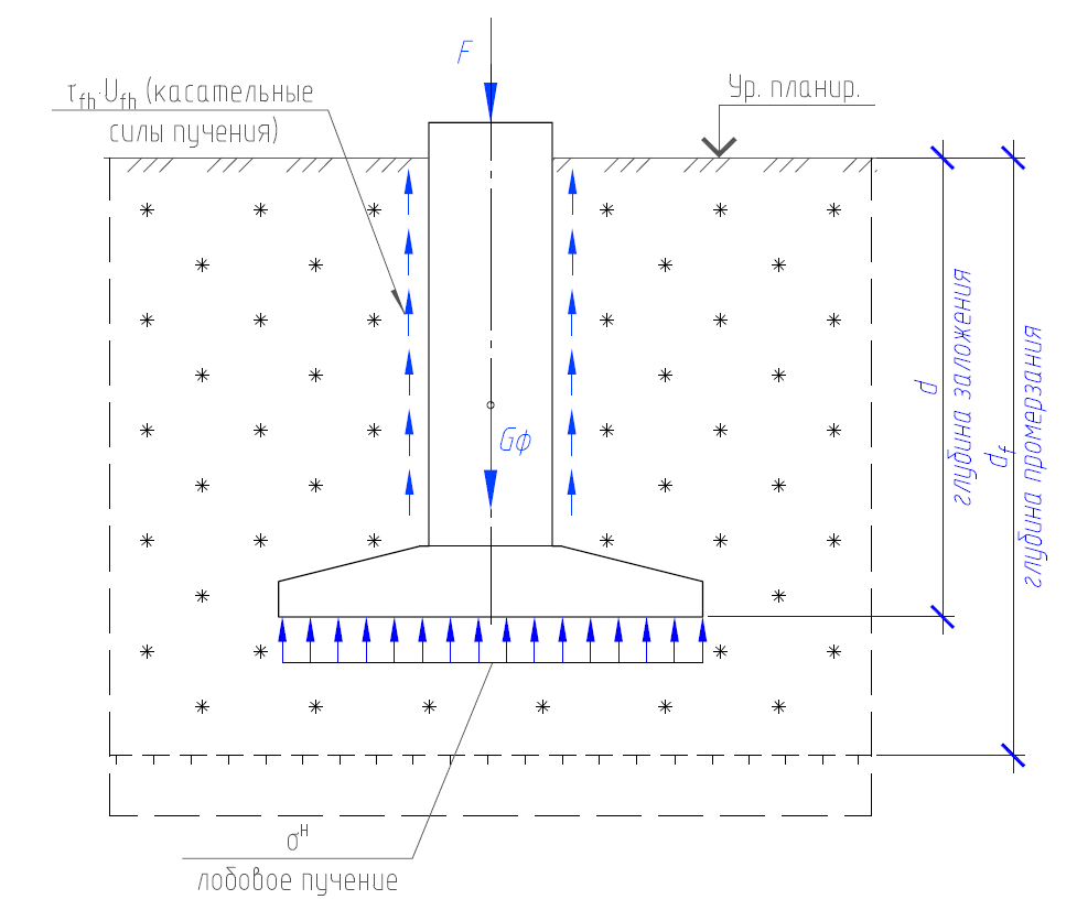 1. Касательные силы морозного пучения — воздействуют на боковые поверхности фундамента если его подошва заложена ниже глубины промерзания.