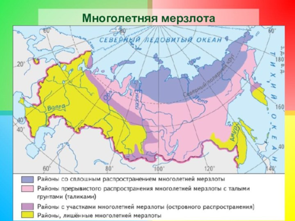 На карте видно, что в том или ином виде большая часть территории РФ имеет участки на которых встречается ММГ или сплошное их распространение. Таким образом около 65% территории России – районы многолетнемерзлых грунтов.